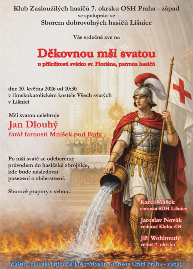 plakat Děkovná mše za dobrovolné hasiče se uskuteční 10.května 2026 od 10:30 v římskokatolickém kostele Všech svatých v Líšnici.